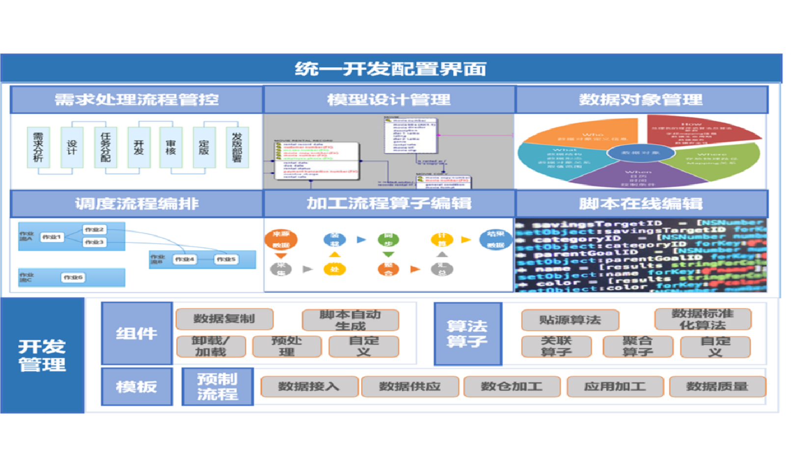 - 元数据的采集过程、数据变更,数据标准的发布、审批,数据质量的数据检核、问题发现、问题处理,数据治理工作全流程支撑开发